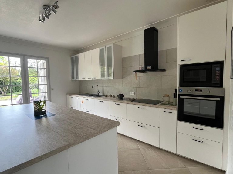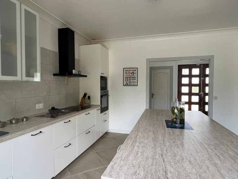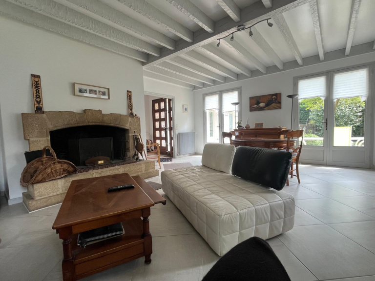 Édifiée sur une parcelle arborée de 1 200 m², la propriété dispose d’un vaste séjour traversant, baigné de lumière grâce à ses ouvertures sur le jardin. Une cheminée confère à cet espace une atmosphère chaleureuse et conviviale. Attenante, une cuisine semi-ouverte, récemment rénovée, aménagée et équipée, constitue un véritable lieu de partage.