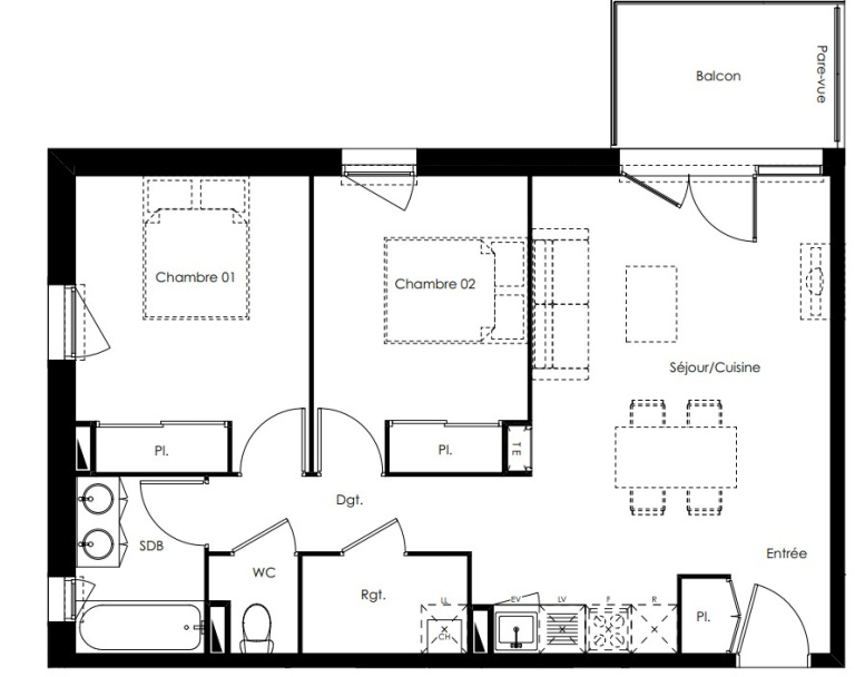 Dès l’entrée, vous profitez d’un placard intégré et d’un bel espace de vie de 25 m² avec séjour et cuisine ouverte, prolongé par une terrasse exposée plein sud, idéale pour profiter des beaux jours.